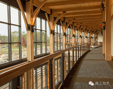 建筑物的桁架為膠合層壓板,從而優(yōu)化了這種可再生資源的結(jié)構(gòu)價值。膠合板消耗能源少于鋼筋混凝土或鋼材,可用于更長的時間跨度,可承受重負(fù)荷,并且擁有復(fù)雜 的形狀。該建筑通過了LEED環(huán)境保護(hù)認(rèn)證,包括一套可再生的膠合板結(jié)構(gòu)系、節(jié)水管道夾具、利用可回收的當(dāng)?shù)夭牧稀⑹覂?nèi)擁有豐富的自然光線以及高效的機械 系統(tǒng)、照明和外表皮。